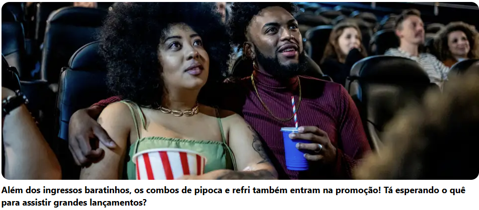 Durante toda a semana, é possível garantir entradas por R$10 (isso mesmo que você leu) e combos de pipoca e refrigerante com valores especiais, tornando o programa completo para duas pessoas por menos de R$50.