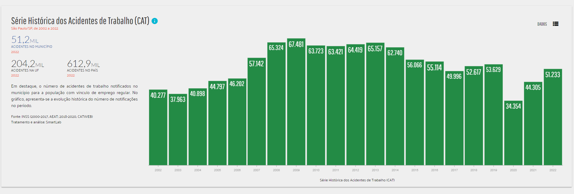 Em destaque, o número de acidentes de trabalho notificados no município para a população com vínculo de emprego regular. No gráfico, apresenta-se a evolução histórica do número de notificações no período.