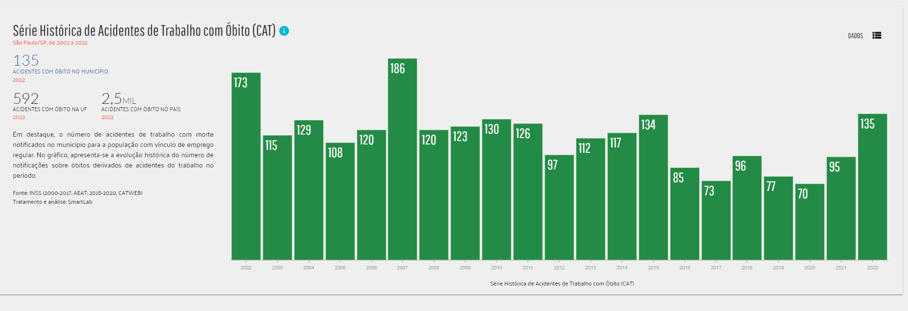 Em destaque, o número de acidentes de trabalho com morte notificados no município para a população com vínculo de emprego regular. No gráfico, apresenta-se a evolução histórica do número de notificações sobre óbitos derivados de acidentes do trabalho no período.