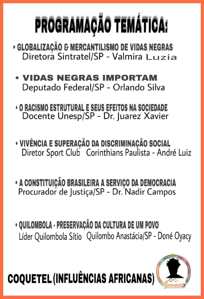 O Encontro contará com a análise de atores sociais, como: cientistas, acadêmicos, parlamentares e militantes das frentes de luta por equidade social a fim de fomentar a aplicação de ações sindicais em apoio às iniciativas em prol da equidade econômica e social deste enorme contingente de afrodescendentes, que laboram no setor do Telemarketing.